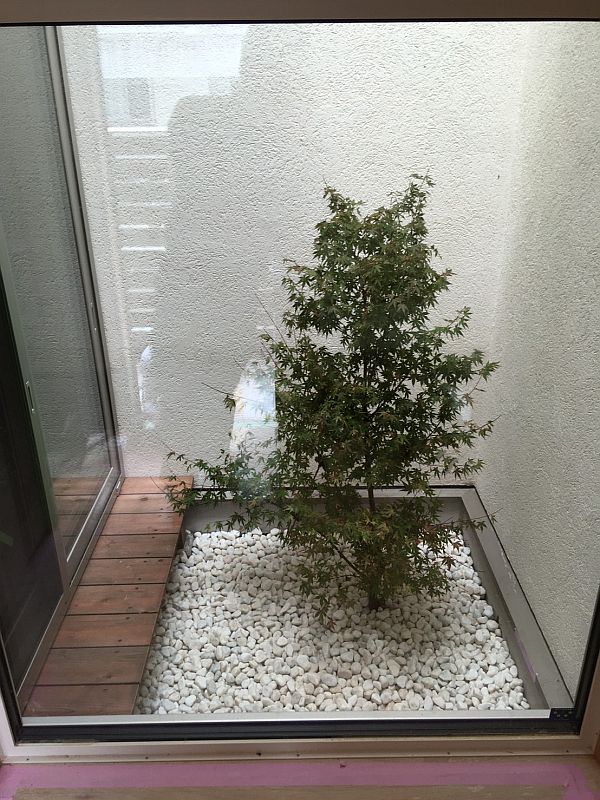 最後に紹介するM様邸のこだわりポイントは、家の中央部に設置した坪庭です。イロハモミジを植栽し、小さな濡れ縁も作りました。周囲を壁で囲っているので、外からの視線も気になりません。
