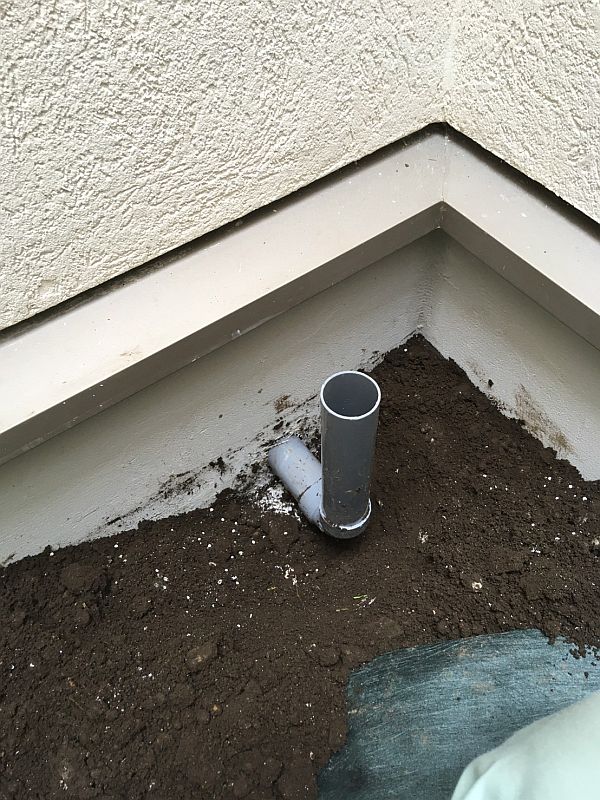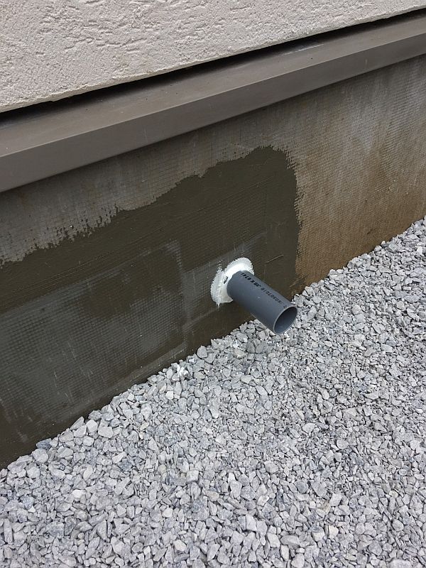 排水管の先は、下の写真のように、基礎の外側に出ています。地面に浸透しきれずに、溢れそうになった雨水は、この排水管を通って建物の外に出る仕組みです。(下の写真は施工途中の写真です。最終的には、もっと目立たないような仕上げを施します)