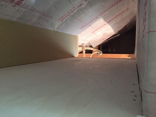 下の写真は、天井エアコンの設置スペースを撮影したものです。写真の一番奥の方、主寝室の真上あたりにエアコンを取り付け、そこからの冷風を、天井に設けた風の通り道を使って、2階の各居室に配分するしくみです。小野寺工務店の建てる家は、気密性能と断熱性能がきわめて高いので、風の通り道さえ確保してあげれば、1台のエアコンで2階全体を冷やすことが可能です。