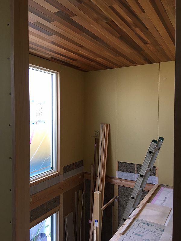 吹き抜けの板張り天井も完成しました。写真の手前側には、この後、スノコを渡し、バルコニーへとつながるスケルトンの廊下ができあがる予定です。