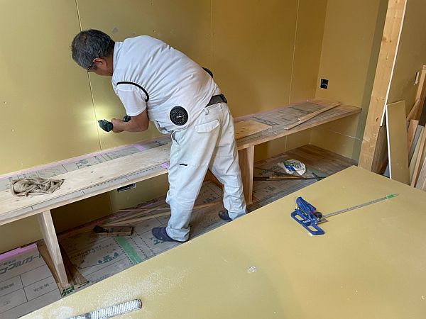 テレビボードを造作する大工のベストにご注目ください!扇風機付きのベストを着用しています。服に扇風機を付けるなんて、バカみたいなアイデアだと思っていましたが、もはや夏の必需品になりました。手放せません!