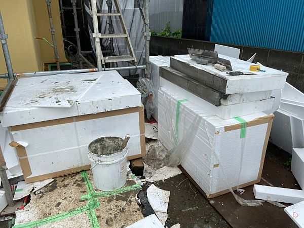 EPSボードをパズルのように、建物の周囲に貼り付けていきます。EPSボードは南極の昭和基地にも使われている断熱材で、圧倒的な断熱性能を発揮します。