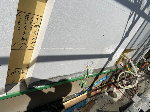 EPSボードは発泡スチロールのような柔らかい素材なので、給湯器などを設置する場所には下地が必要です。ガス屋さんからの指示、とてもわかりやすくて助かります!