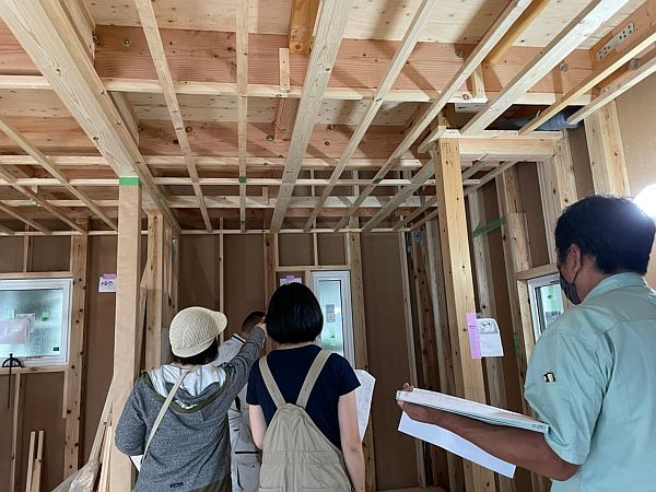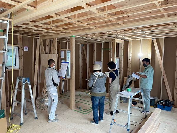 下の写真はMM様邸で実施した「電気打ち合わせ」の様子です。電気打ち合わせというのは、上棟後、ある程度大工工事が進んだ段階で行う、照明やコンセント、スイッチの位置や数を現地で確認するミーティングのことです。