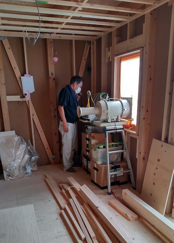 電気打ち合わせが終わると、いつものように気密測定を実施して・・・