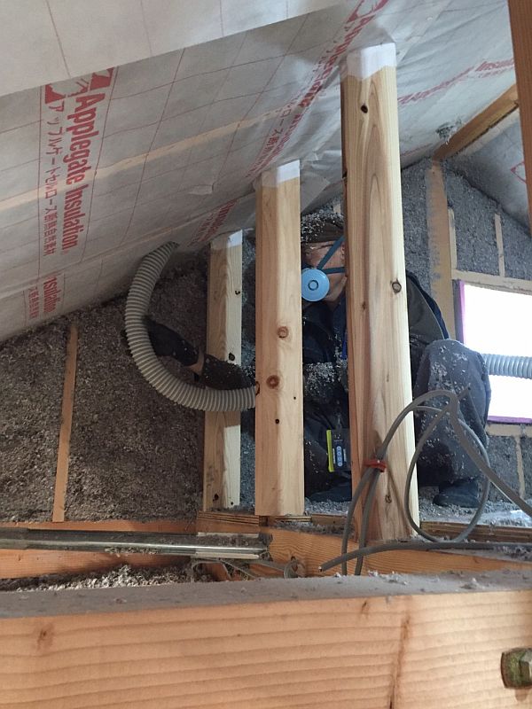 その後、アップルゲートのセルロースファイバーを使用した建物内の充填断熱工事へと進みます。下の写真は、天井部分にセルロースファイバーを吹き入れている職人さんです。