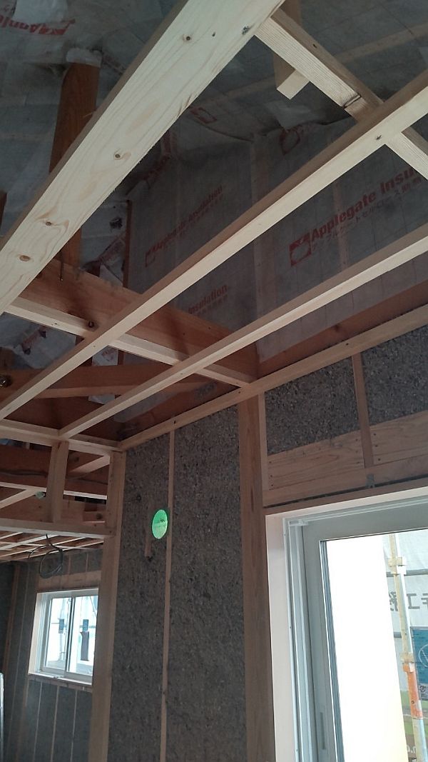 前回、アップルゲートを使用した屋内断熱工事の様子を紹介したMK様邸。今回は、建物の中で進む様々な大工工事と、付加断熱(外断熱)工事の様子を紹介します。