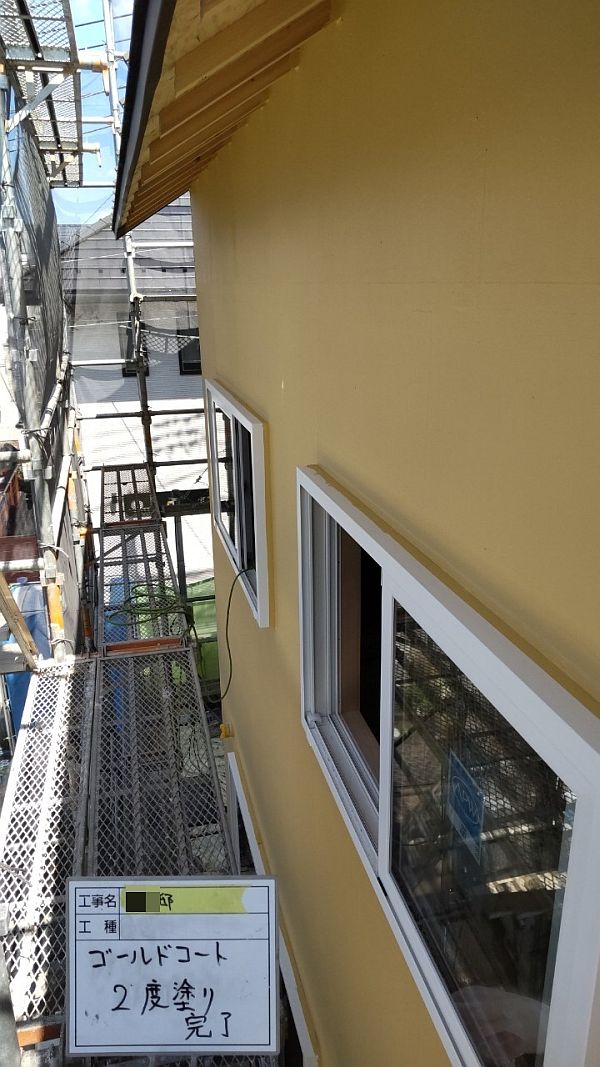 建物の外では、防水・透湿塗膜材「ゴールドコート」の塗装が完了しています。この後、付加断熱(外断熱)用の断熱材・EPSボードを貼っていきます。