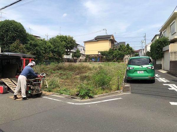 地盤調査完了後、草刈りを行いました。青空がきれいです。もうすぐ基礎工事が始まります。