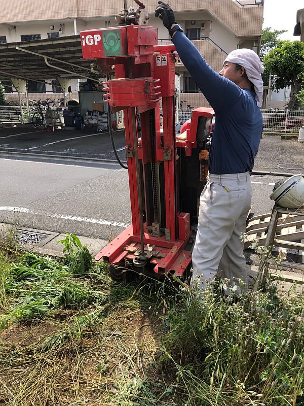 こちらが地盤調査会社の技術員の方です。雑草が生い茂る中、雑草をなぎ倒しながら、調べていただきました。感謝です!