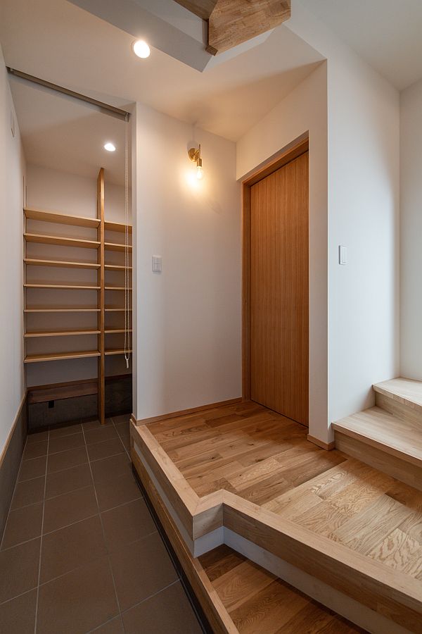 反対側から撮影した玄関の写真です。右側の扉を開けると主寝室。奥にはシューズクロークを設けています。