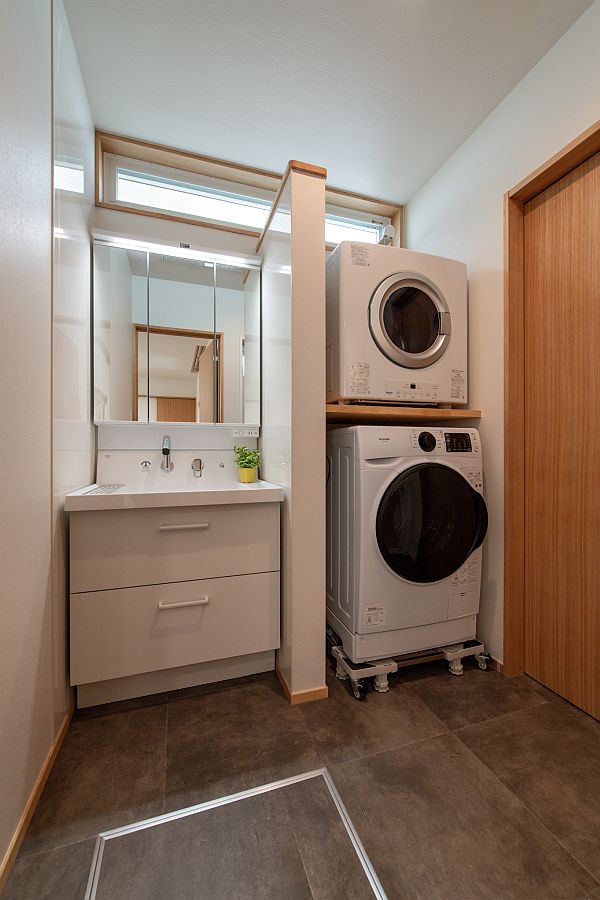 主寝室の奥には、ガス乾燥機の「乾太くん」を設置した洗面脱衣室があります。乾太くんはガス乾燥機なので、背面に排気用のダクトを取り付ける必要があります。しかも奥さまからは、採光のためにハイサイドライトを設置したいというご要望もありました。限られたスペースに、洗濯機、乾太くん、洗面台、ハイサイドライトをパズルのように組み合わせて取り付けるために、洗濯機はもちろん、洗濯機の下の台座のサイズまで測って、細かな展開図を書き起こして作った、苦心の洗面脱衣室です。