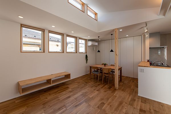 続いて2階リビングの紹介です。2階リビングの床もオークの無垢材で施工しています。勾配天井と南面にハイサイドライトを採用した明るいリビングです。