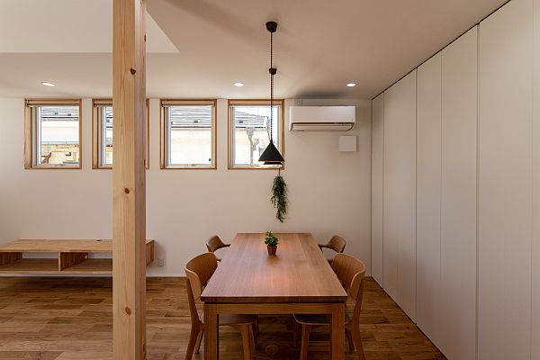 角度を変えて撮影した主寝室です。坪庭にはイロハモミジを植栽しています。左下に床下エアコンのルーバーが見えます。