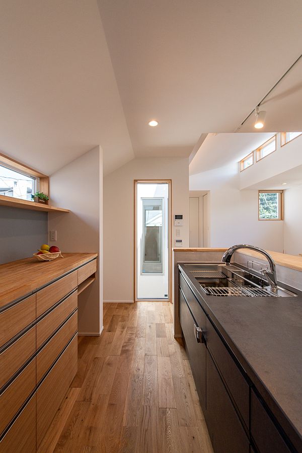 キッチンから見たリビングです。坪庭に面した窓は、床面から立ち上がるFIX窓を採用しました。坪庭に植栽したイロハモミジが成長すると、いずれここからも緑を楽しむことができるはずです。