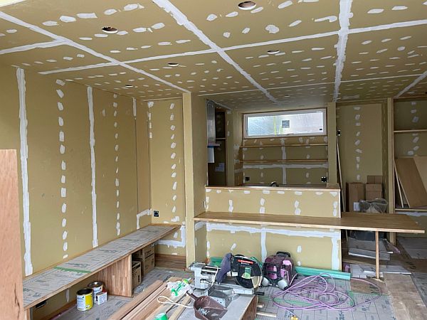 壁紙を貼る下準備のパテ処理が始まっています。壁の下地材の継ぎ目とビスの頭の凹み部分を丁寧にパテで平らにしていきます。