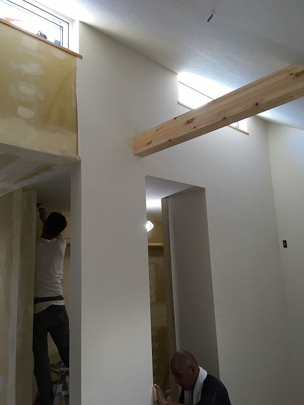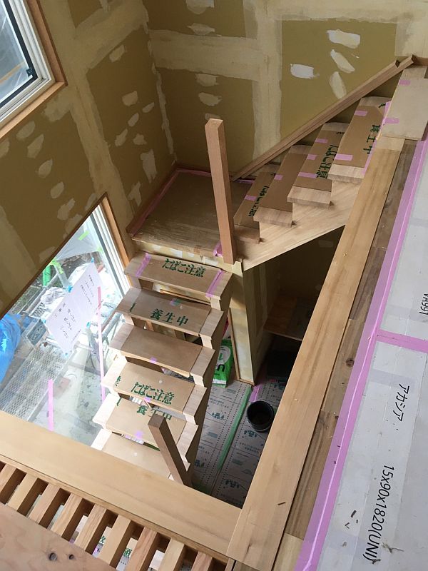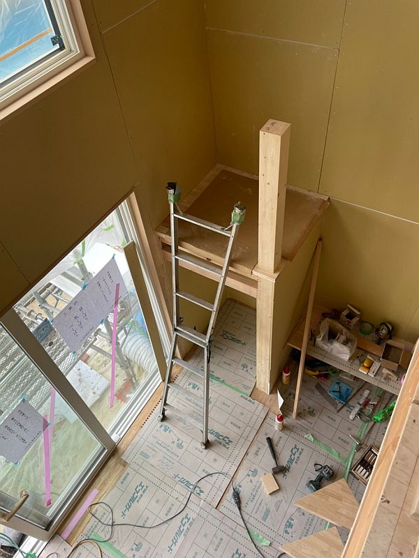 壁紙(クロス)工事の少し前に行った吹抜け部分の階段の施工の様子です。まずは踊り場を作った段階。