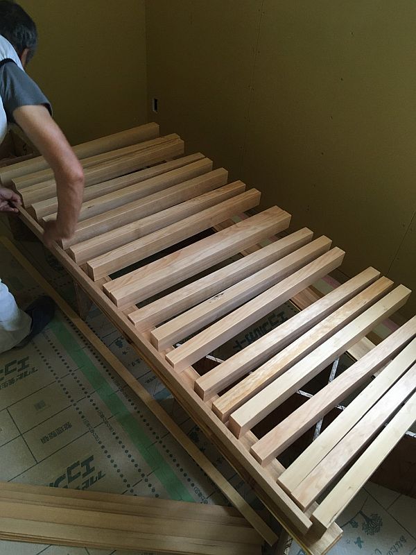 下の写真は、吹き抜けに設置するスノコ状の渡り廊下を製作する大工です。