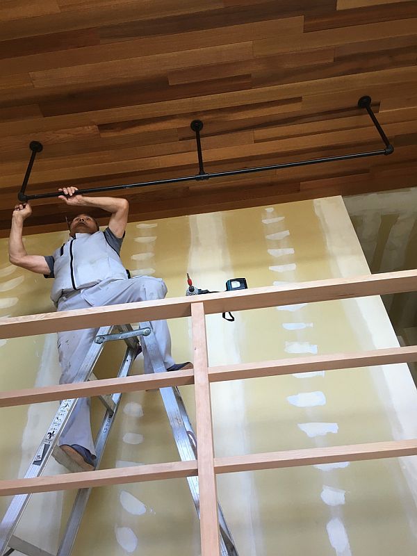 下の写真は、吹き抜けの板張り天井にアイアン製の室内物干しを設置する職人さん。この室内物干し、生活感がなくオシャレなので、けっこう人気で、品薄状態が続いています。