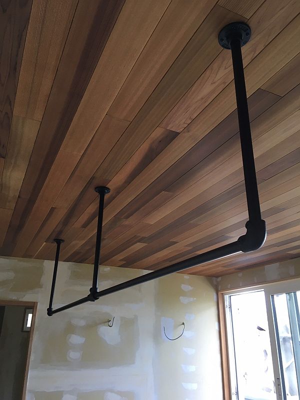 室内物干しの仕上がり写真です。ちなみに板張り天井の素材はレッドシダーです。バラバラの状態で納品される板を、一枚一枚、色や柄を見て、同じような色が横並びにならないように組み合わせていきます。センスと腕力の必要な作業です。