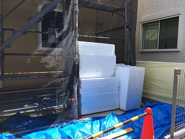 写真の白い発泡スチロールのような板が付加断熱(外断熱)用の断熱材・EPSボードです。