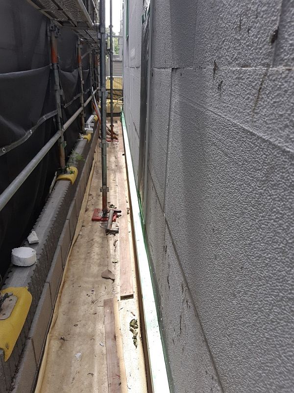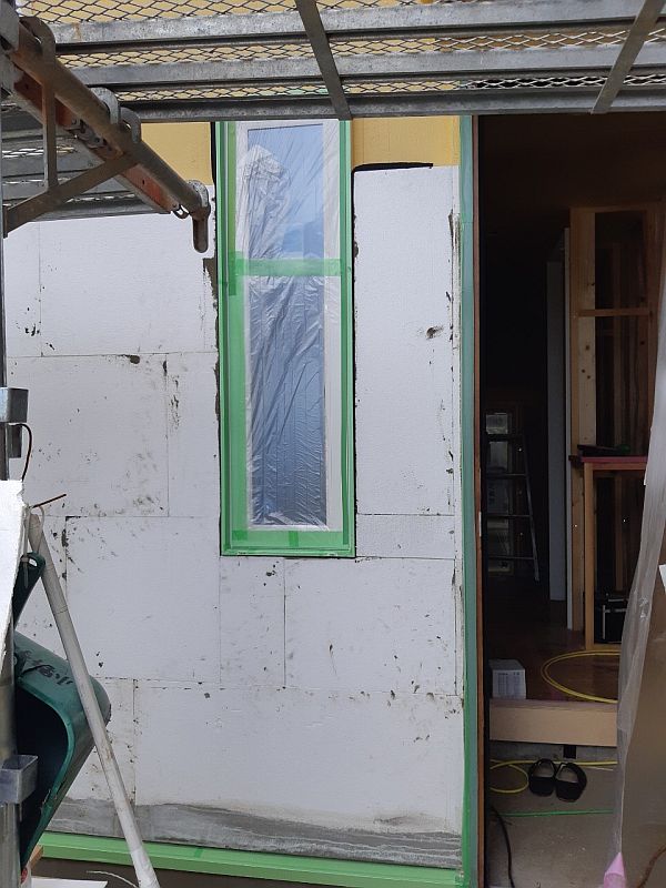 EPSボードの施工が終わりました。このあとベースコートという接着剤兼保護剤を上から塗っていくのですが、その様子は来月号でレポートします。