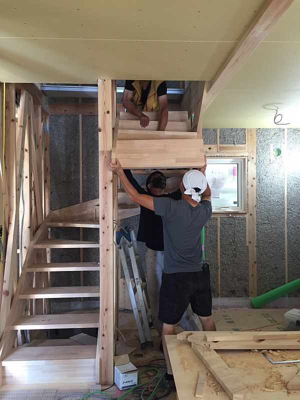 それでは家の中を見ていきましょう。下の写真は階段の設置を進める職人さんたち。3人がかりで持ち上げて、組み立てています。