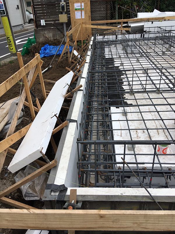 基礎ができあがりました。コンクリートの基礎と一体化するように分厚い断熱材(パフォームガード)が設置されているのがわかりますでしょうか。
