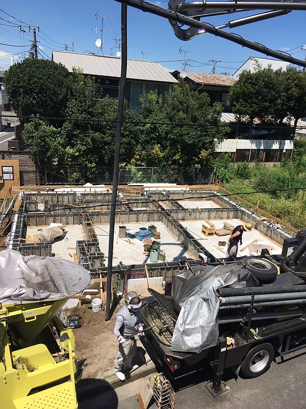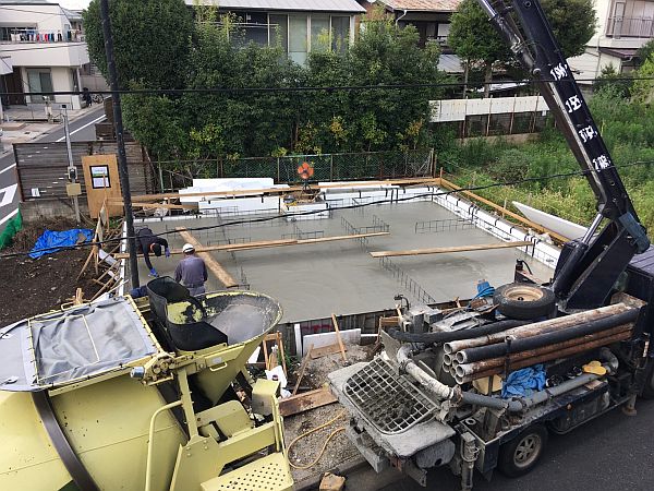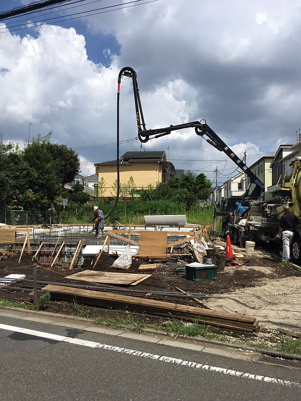 配筋検査が終わると、コンクリートの打設です。コンクリートを流し込み、建物の基礎を作っていきます。まずは基礎の底面の打設です。
