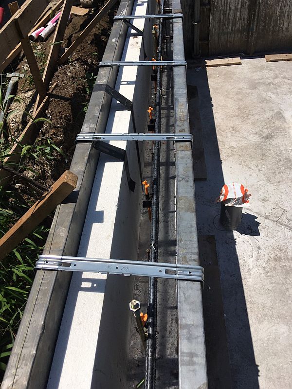 底面の打設が終わると、立ち上がり部分を作っていきます。パフォームガードを挟み込むように型枠を立て、その間にコンクリートを流し込んでいきます。