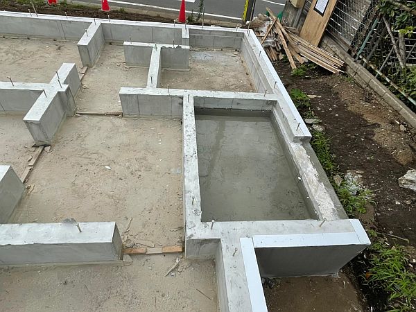 コンクリートが固まるまで数日間待ちます。下の写真の手前側が高基礎(深基礎)になっている箇所です。