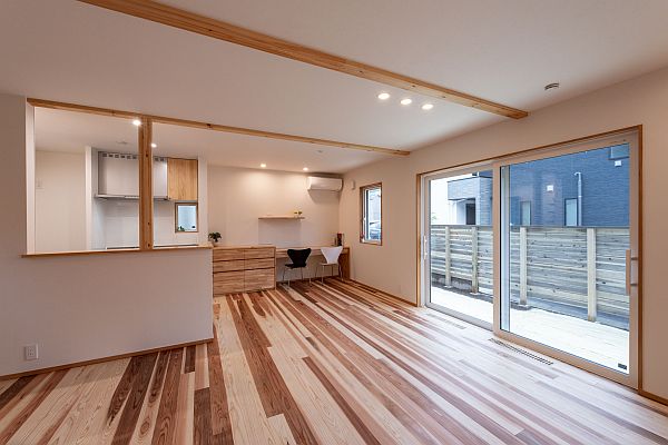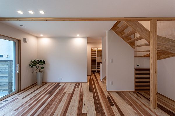 1階南側のLDKです。床には無垢の杉板を使用しています。紅い木肌と白い木肌、色味がハッキリしているのが杉板の特徴ですが、それも最初だけです。2年ほど経つと全体的に飴色の木肌に変化して、色の違いはあまり目立たなくなります。