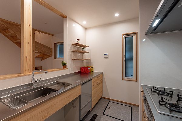 キッチンスペースです。MM様邸のキッチンは、II型のセパレートキッチンです。シンクとコンロを横並びにしたI型キッチンに比べて選ばれる方の少ないセパレートキッチンですが、振り返るだけで複数の作業を同時にこなせるので、お料理好きな方に人気のレイアウトです。