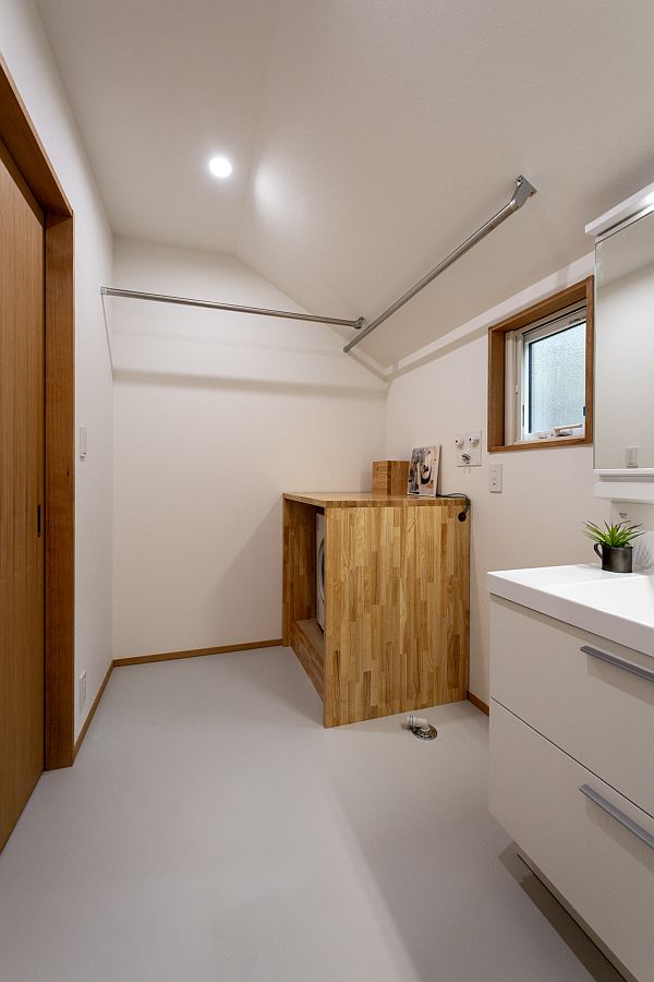 2階の洗面室です。奥の大きな木箱は、ガス乾燥機の「乾太くん」用の収納ボックス兼作業用カウンターです。
