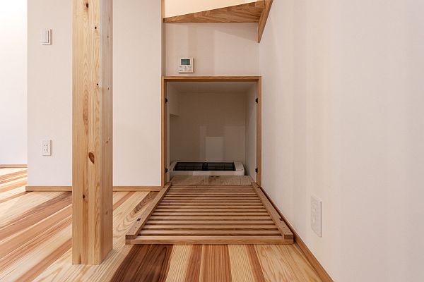 1階、階段下の床下エアコンのメンテナンス口です。ルーバーを手前に開けると、エアコンが姿をあらわします。開口部の左上にリモコンを付けています。