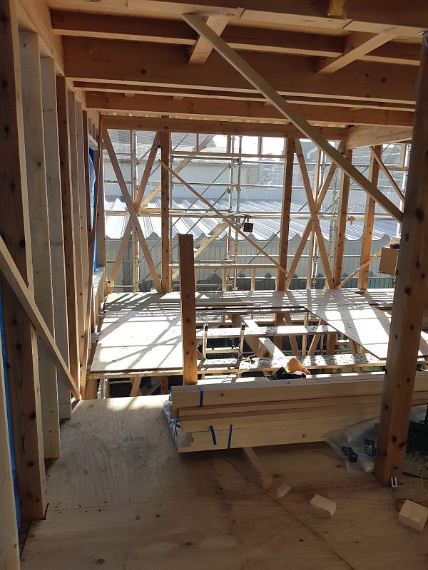 木工事が進むN様邸。手前は2階の子供部屋になる部分。写真の奥の方は、吹き抜けになる場所なので、床ではなく、板を渡しています。
