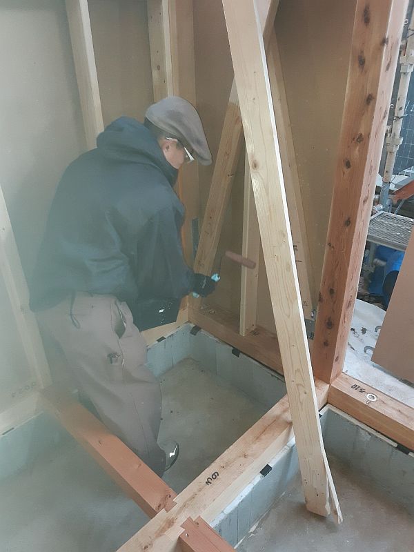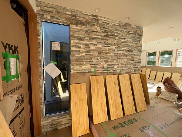 もう一枚、玄関横のバンピーウォールとFIX窓の写真を貼っておきます。こちらの方が、「石壁にガラスだけが嵌め込まれている」という状態がわかりやすいかもしれません。たくさん並べてある板はシューズクローク用の棚板です。現場でクリア塗装して乾かしています。