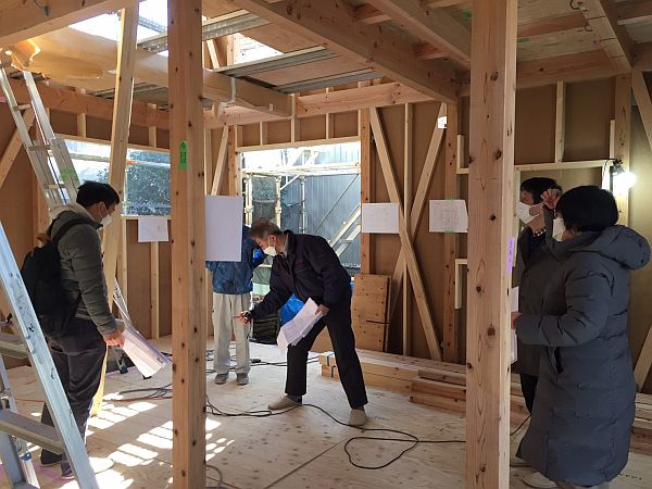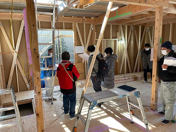 大工工事がある程度進んだ段階で、N様のご家族と一緒に「電気打ち合わせ」を行いました。電気打ち合わせでは、スイッチやコンセントの場所や数、照明の位置などをひとつひとつチェックしていきます。