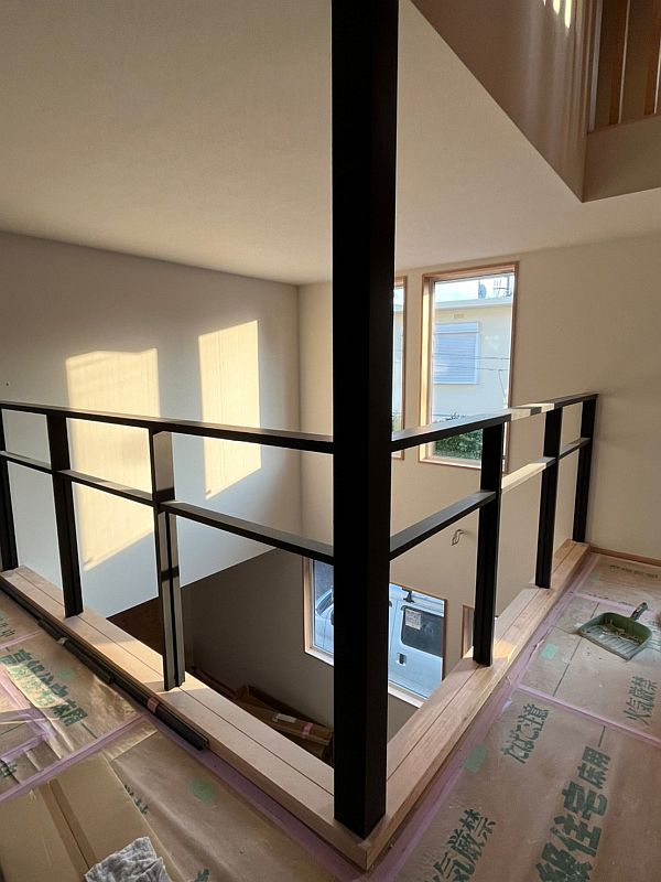 吹き抜けに面した2階ホール。手すりは上で紹介している階段の吊り下げ金具の艶消しブラックと同じ色になるように塗装して、意匠的統一感を出しています。素材が鉄と木で異なるため、同じ色の塗料を塗っても同じ色には仕上がらないので、塗料の調合を微調整して、同じ色になるように仕上げています。