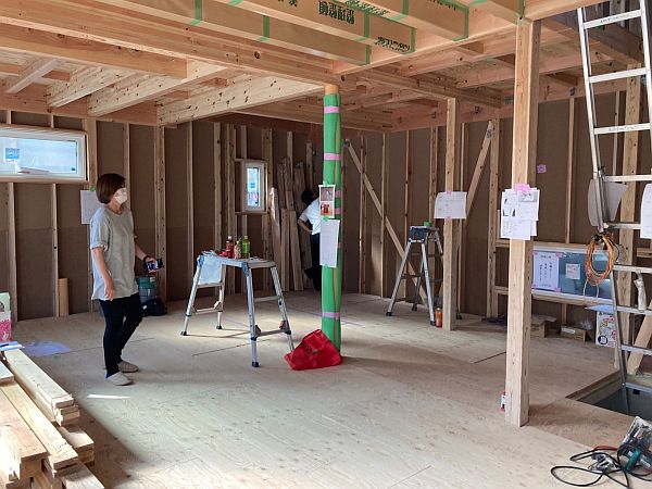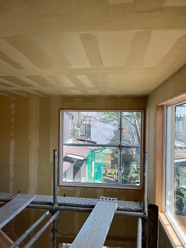 完成に向けて、急ピッチかつ丁寧な工事が進むN様邸。屋内では壁紙(クロス)工事など、家づくりの最終工程がはじまっています。