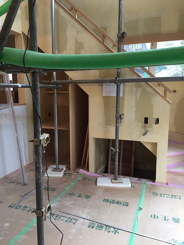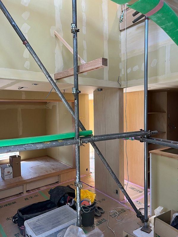下の写真は、壁紙工事のために内部足場を組んだリビングの吹き抜けスペースです。壁の縞々模様は、壁紙を貼るための前処理としてパテを塗った跡です。下地材のつなぎ目やビスの頭の凸凹をパテで均していくのですが、この工程の精度が仕上がりに大きく影響します。