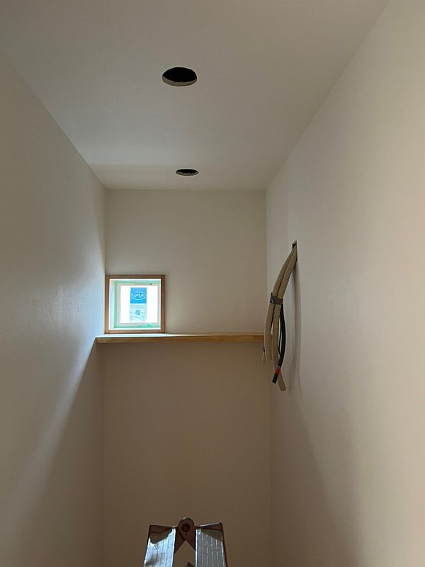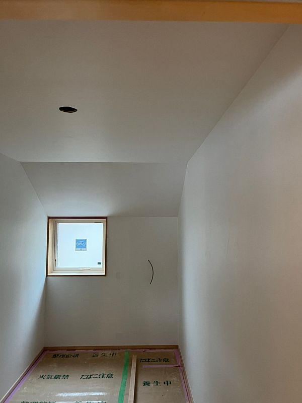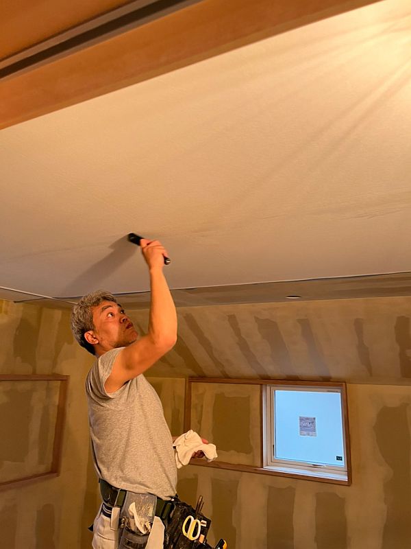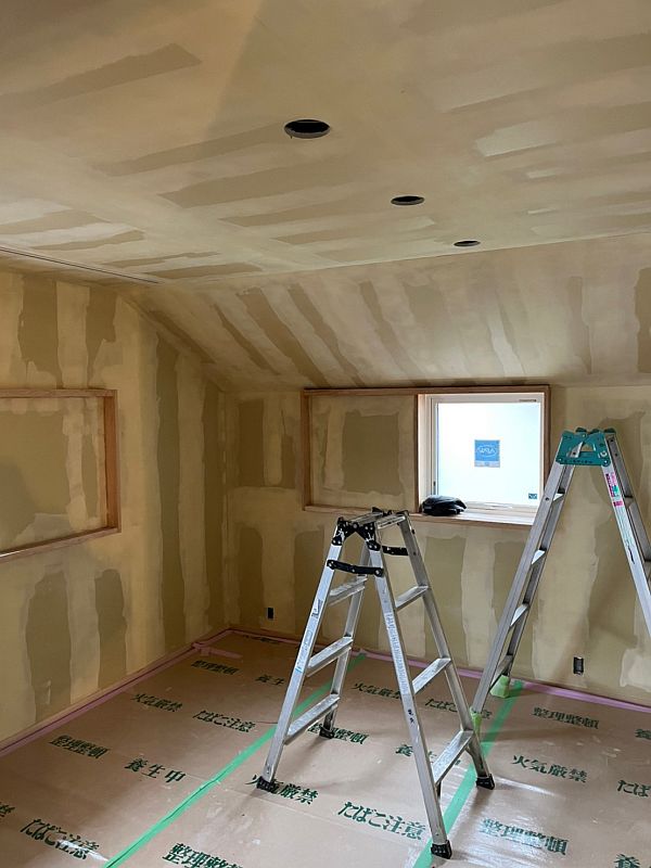 続いてパテだらけの2階主寝室の写真です。断熱材に調湿性能の高いセルロースファイバー(アップルゲート)を使う以上、透湿性・通気性の低いビニールクロスを壁に貼るのはもったいないので、エコフリースなどの紙製クロスをおすすめするようにしています。ビニールクロスと違って、紙のクロスは薄く、下地の凸凹の影響をモロに受けるので、パテ処理は念入りに施す必要があります。