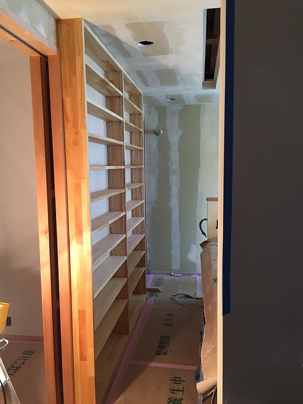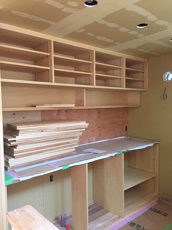 キッチン背面の造作カウンターもできあがりつつあります。奥行きの異なる収納棚はN様からのリクエストです。