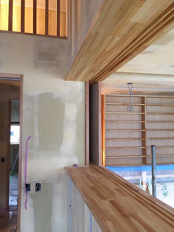 続いて吹き抜け1階部分の写真です。写真中央、壁から突き出ている細長い木枠の中にはダイニングテーブルを照らすためのライティングレールが組み込まれています。この木枠、間取り図ではマッチ棒のようにスッと簡単な線で描かれているだけですが、実際に作る際は、どのようにして壁に固定するか、木枠の材料は何を使うか、どの程度の強度を持たせるか、補強材の角度は?など、いろんなことを考えに考えて作ります。