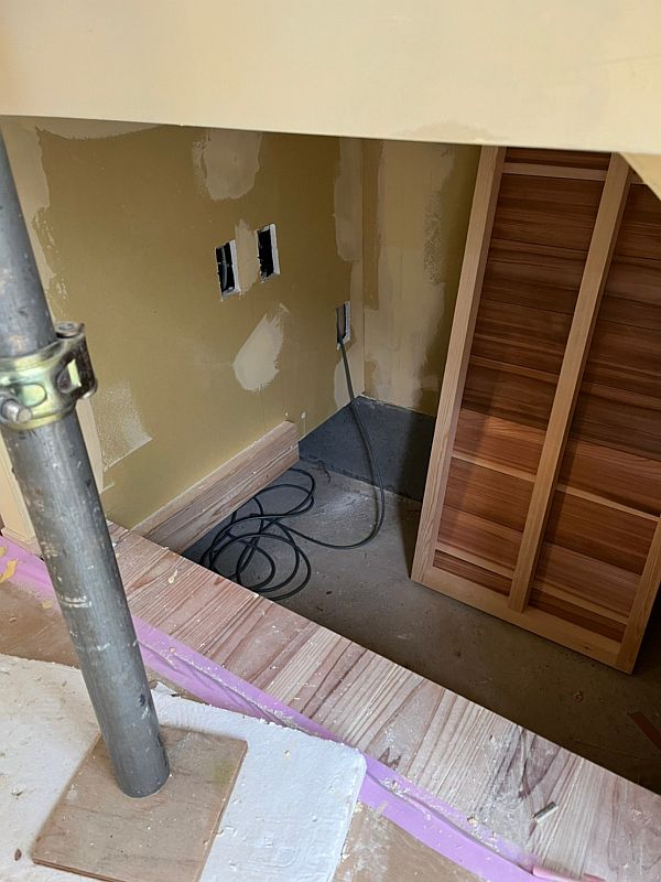 上の写真の一番右側、床下エアコン&ルンバの基地スペースです。左の壁の2つのコンセントは、1つはエアコン用で、もうひとつはルンバ用です。奥の穴から黒いコードが伸びていますが、これはエアコンの有線リモコンの配線です。