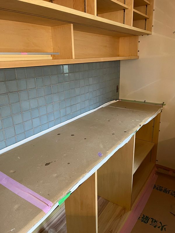 キッチン背面カウンターの造作も進んでいます。名古屋モザイクの落ち着いたブルーグレーのタイルが入りました。N様邸の完成まであと少しです。