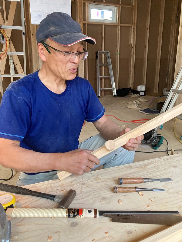 N様邸の階段の手すりを作る鈴川大工。N様から階段の手すりを八角形にしたいというリクエストがあり、それなら壁と手すりの接続部分も八角形にしようということで、鑿(のみ)を使って細かな造作をしているところです。こういう細かな造作が大好きな男です。
