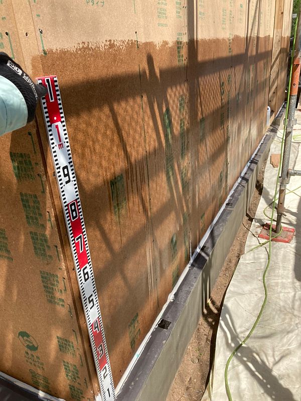 まずは防蟻処理のレポートから。下の写真はNA様邸の耐力面材(外壁下地)の屋外側に防蟻剤をたっぷり塗布したところです。基礎の上端から規定の高さまでしっかり塗り込んでいます。