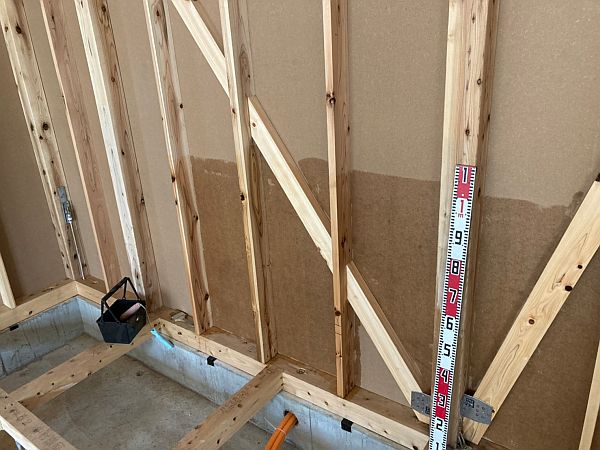 図面上で何カ月もかけて検討を重ねてきたコンセントの位置やスイッチの位置ですが、実際に実物の家の中で確認を進めていくと必ずといっていいほど変更が発生します。特にコンセントの数と位置は、住み始めてから後悔するポイントの殿堂入り級の第一位ですので、家具と電気製品をどのあたりに置くか、しっかりイメージしながら確認してもらうようにしています。