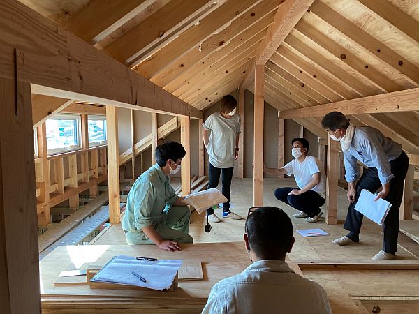 上棟打ち合わせのひとコマパート2。屋根裏の使い勝手について、真剣に話し合うNA様ご夫妻と小野寺工務店のスタッフ。左奥にドーマー部分の窓が見えています。